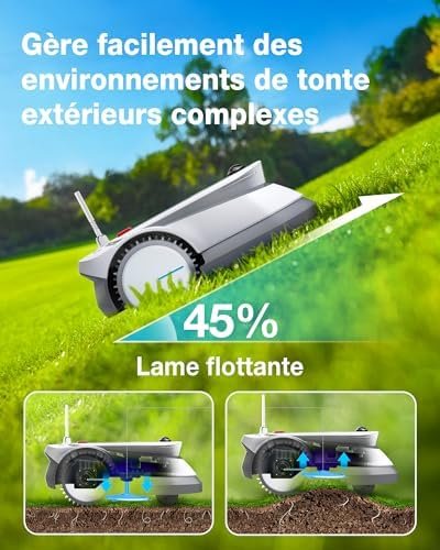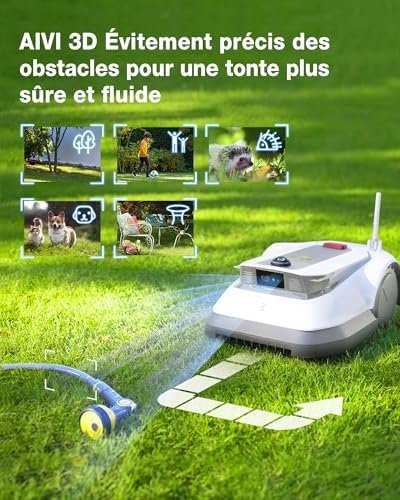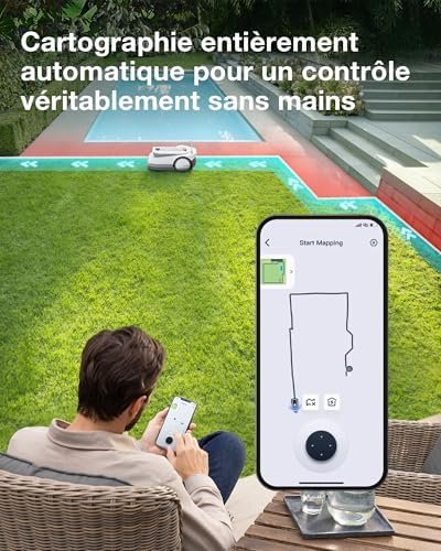 Nous étions à la recherche d’un robot tondeuse depuis plus d’un an et nous avons enfin franchi le pas. Je ne voulais pas d’un robot nécessitant l’installation d’un câble périphérique mais plutôt d’un robot véritablement autonome, capable de naviguer de manière indépendante, méthodique tout en évitant les obstacles.Après de longues recherches, mon choix s’est finalement porté sur ce modèle car il est entièrement autonome et parfaitement adapté à la superficie de mon terrain, annoncé pour 800m². Pour information, je dispose d’un terrain de 500m².Je l’utilise depuis une semaine désormais et son efficacité est remarquable, malgré un terrain quelque peu complexe, parsemé d’obstacles (cabane de jardin, parterres de fleurs, serre, arbres et arbustes), une légère pente et un passage étroit permettant d’accéder à la partie avant du terrain.Mon expérience est très positive : le robot a été livré dans un très gros carton incluant sa base, deux balises et quelques accessoires, notamment des lames de rechange.L’installation s’est déroulée sans encombre, l’absence de câble périphérique est un véritable atout. Il suffit de placer un nombre suffisant de balises aux endroits stratégiques, de délimiter la périphérie de votre terrain à l’aide de l’application et le robot est prêt à tondre de manière totalement autonome avec une grande précision. Il tond en créant de belles lignes droites.L’application est très complète : elle permet de surveiller l’usure des lames, l’autonomie restante, de contrôler le robot manuellement, de modifier le sens de la tonte, d’établir un planning de tonte, de définir des zones interdites, d’activer une alarme en cas de soulèvement, d’accéder aux journaux de tonte, de surveiller le jardin en votre absence grâce à la caméra 360°, parmi bien d’autres fonctionnalités non citées ici.Les principaux atouts de ce robot, selon moi, sont :- L’absence de câble périphérique à enterrer- Totalement autonome- La facilité d’installation- Son efficacité et sa précision- Sa discrétion sonore, ce qui me permet de l’utiliser le dimanche ou les jours fériés sans problème.- Une application pour smartphone très complèteJe suis extrêmement satisfait de ce robot. C’est un excellent choix pour ceux qui recherchent une solution de tonte efficace, autonome et connectée. Il transforme l’entretien de la pelouse en un jeu d’enfant et surtout sans effort.