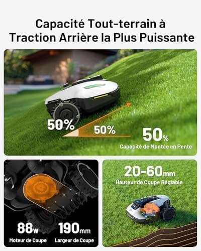 Le premier système NetRTK+Vision au monde : pas besoin d’installer de station RTK ; prêt à l’emploi dès sa sortie de l’emballage. Alimenté par le module NetRTK et le module 4G, tous deux gratuits jusqu’en 2025, il assure un positionnement stable au centimètre près, même sous les arbres ou dans les passages étroits. La station RTK est toujours offerte. Réglez une fois, gagnez le reste : Basé sur la technologie avancée de vision IA et RTK, YUKA mini peut créer des cartes virtuelles de manière autonome dans l’application Mammotion. Pour une pelouse de 800 mètres carrés, il peut générer une carte entière en seulement 10 minutes. Installation sans fil périphérique et plus besoin de le déplacer manuellement sur la pelouse ! L’algorithme piloté par IA de YUKA mini garantit une couverture précise des coins aux bords, avec une précision de coupe à moins de 5 cm* du mur, garantissant des bords nets. Module de vision IA UltraSense de pointe : Lorsque le sol et les bords de la pelouse sont alignés, YUKA mini robot tondeuse peut se déplacer le long de la limite pour une coupe nette et précise. Détectez les limites invisibles pour rester dans les zones de tonte désignées, même sans signaux satellites. Reconnaissance et évitement d’objets IA La technologie de reconnaissance et d’évitement d’objets 3D par apprentissage profond IA de YUKA mini excelle dans la détection et l’évitement des obstacles. Gérez facilement jusqu’à 15 zones de tonte différentes: Avec l’application Mammotion, vous pouvez facilement configurer des tâches de tonte pour jusqu’à 15 zones de travail et créer des chemins entre elles, même des chemins étroits entre les maisons. Définissez des horaires, des modèles de coupe et des hauteurs de coupe différents pour chaque zone de tonte. Créez des zones interdites pour les zones qui n’ont pas besoin d’être tondues, comme les parterres de fleurs ordinaires, les terrains de jeux ou les piscines. Avec son dégagement vertical de 3,5 cm et sa capacité à naviguer sur une pente de 50 % (27°), YUKA mini peut fonctionner dans plus de 99 % des jardins résidentiels. Une fois installé, YUKA mini se chargera de couper l’herbe, de tailler les bordures et de s’adapter à diverses espèces d’herbe. Sa navigation intelligente permet d’effectuer 1 à 3 trajets supplémentaires le long de la bordure pour que la pelouse soit parfaitement tondue, minimisant ainsi les endroits manqués et vous permettant d’avoir facilement une pelouse semblable à un tapis. Amélioration de l’efficacité de coupe triple : YUKA mini robot tondeuse adopte une conception à disque de coupe unique et à disque de coupe flottant, avec une largeur de coupe de 190 mm (7,2 pouces), garantissant une efficacité et une coupe précise des bords. Le réglage dynamique de la hauteur assure une hauteur de coupe uniforme (20-60 mm (0,78-2,64 pouces)) sur différents terrains. YUKA mini peut tondre jusqu’à 80 mètres carrés de pelouse par charge complète.