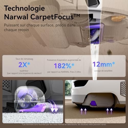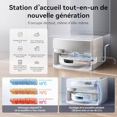 Un aspirateur tres jolie compacte et silencieux, seulement malgré sa maj, j’ai rencontré plusieurs points négatifs :-n’a pas réussi a cartographier l’ensemble de mes pièces au 1er coup. Obligé de relancer plusieurs fois.-nettoyage sous lit très bas perfectible, pas de logique dans le sens de passage, il finie le nettoyage a moitié.-utilise énormément d’eau, mon bac de 4 litres s’est vidé après 5 pièces.-puissance d’aspiration par défaut faible, par rapport a d’autre robot, il faut régler en fort.-laisse des gouttes d’eau au sol en sortie de station, et pendant le nettoyage.-la serpillière rétractable laisse des zones sèches. -la brosse latérale n’arrive pas totalement dans les angles.-impossibilité de paramétrer et d’ajouter une zone de tapis.-pas de bac detergeant automatique-eau froide pendant le nettoyage.-pas d’accès au bac a eau du robot.Je possède un mova Z50 ultra et en les comparants, le mova nettoie mieux les sols que le narwal. Surement due a une pression plus élevée de la serpillière, et grace a sa petite serpillière latérale en tournant autour d’un obstacle il est plus precis que la serpillière retractable du narwall. Bref pas convaincu.