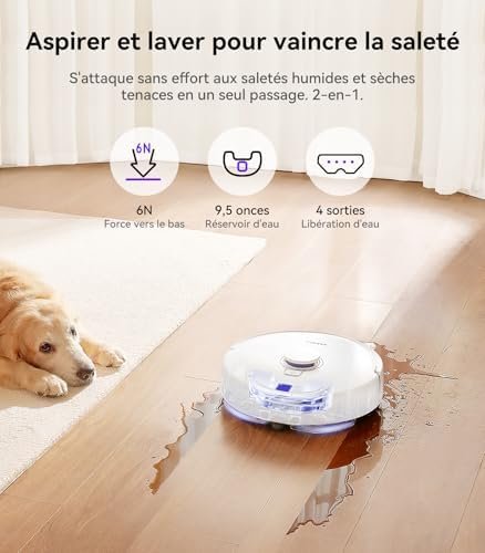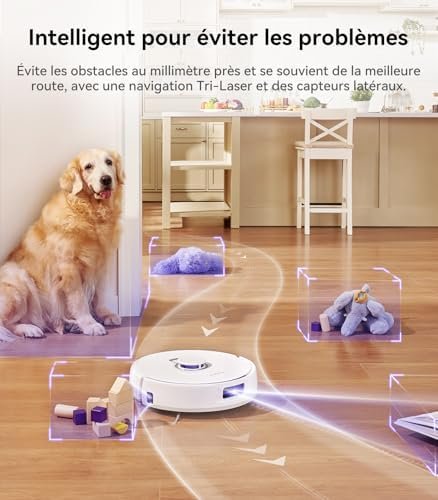 Si vous souhaitez un aspirateur qui navigue bien dans votre maison (tant que vous rangez un minimum les câbles et autres petits objets bloquants), qui ne nécessite pas d’acheter des sacs de poussière et n’a pas de station de vidage imposante (tout est stocké dans le robot), celui-ci est vraiment bien. Point bonus, il est relativement silencieux, et la serpillère est, comme prévue pour le prix, une petite aide pour rendre le carrelage un peu plus propre, mais il faut bien penser à la retirer pour la laver après chaque passage.MAIS- La promesse du « capacité de 7 semaines » est juste fausse, ou alors il faut s’en servir dans une petite pièce sans animaux et sans aérer la pièce (pour réduire la poussière), actuellement je suis pense être en-dessous des deux semaines, ce qui reste acceptable mais bien loin de ce qui est affiché. L’aspiration reste possible au-delà, mais j’ai un gros doute sur les performances une fois que le bac est plein à 90%, même avec le soi-disant compactage des déchets.- L’application est vraiment mauvaise – Impossible de lancer rapidement un nettoyage, il faut faire un paquet de clics avec des chargement à chaque fois avant d’atteindre l’action que l’on souhaite. – Les notifications sont buggées et visuellement moches (texte à trou, pas d’icône…) – Pas d’utilisation avec autre chose que Amazon Alexa – Des bugs par-ci par-là, ma tâche de nettoyage journalière à 13h s’est déclenchée une fois à… 7h. J’ai bien tout vérifié, la tâche est bien réglée pour 13h, et l’historique indique bien le début de la tâche prévue à 7h. Super.Bref, si vous comptez programmer le robot, et le laisser seul par la suite, il est relativement bien (en dehors des bugs avec les horaires de programmation), mais dès qu’il s’agit d’utiliser l’application, mieux vaut rester sur une valeur sûre comme un Roborock.