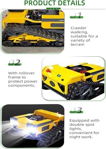 Mobilité améliorée du type Crawler : dispose d’une prise ferme conçue pour divers terrains complexes avec une marche arrière in-situ à 360° et une traction supérieure pour une maniabilité sans faille. Éclairage lumineux pour les opérations nocturnes : équipé de lumières haute luminosité pour garantir une visibilité claire pendant le désherbage nocturne, avec une caméra à distance en option pour une surveillance améliorée. Hauteur du châssis réglable : le châssis réglable s’adapte à différents types de terrain, permettant une tonte polyvalente et une rétention de la hauteur de l’herbe personnalisable. Puissance hybride essence-électrique : ce moteur hybride offre une puissance robuste et permet un fonctionnement continu, ce qui le rend adapté aux tâches exigeantes. Affichage de l’état de l’alimentation en temps réel : gardez une trace de l’utilisation de la batterie sans effort. La télécommande améliore la commodité, améliorant considérablement le temps de travail et l’efficacité de la zone.